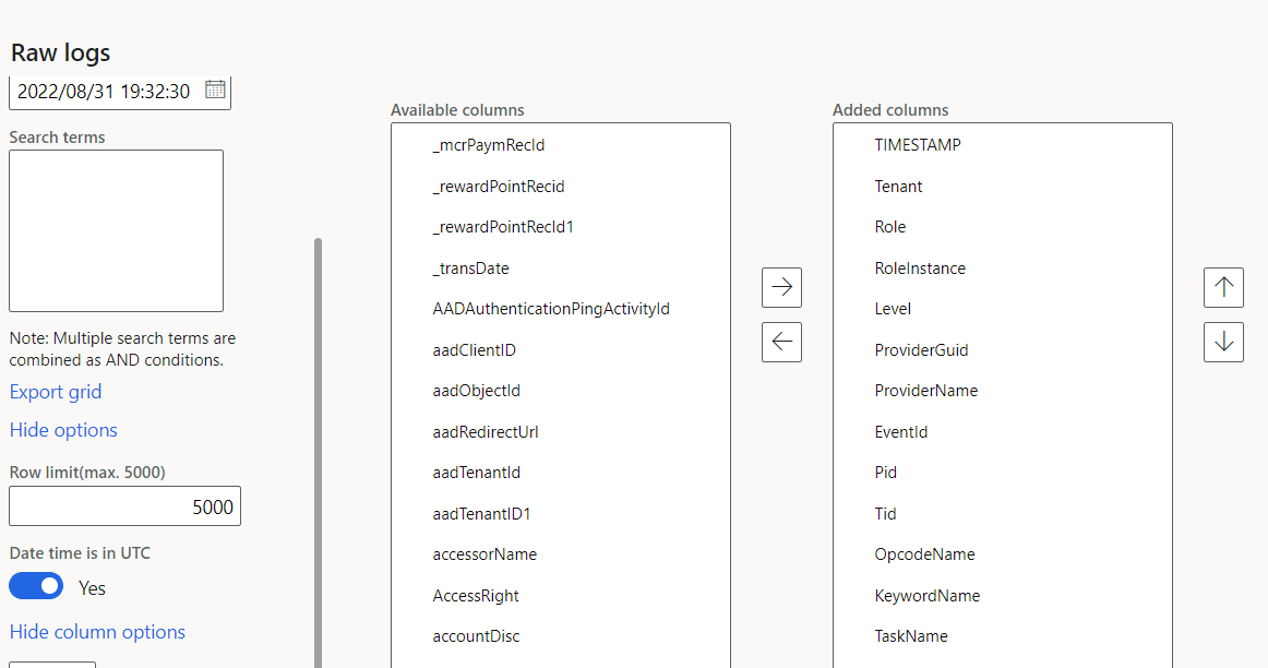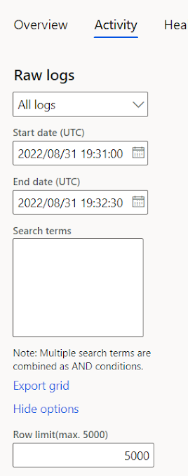 É muito importante que seu filtro busque informações no momento exato que determinada exception ocorreu. Caso você não tenha essa informação, peça para que um usuário execute o processo mais uma vez e lhe passe a hora exata em que isso foi feito. Com o horário em mãos, atribua um range nos campos Start date (UTC) e End date (UTC) de forma a garantir que aquele momento em que a exception ocorreu esteja incluso neste período. Caso apareça o erro em um dialog, peça para o usuário lhe passar o activity id que aparecer, ele te ajuda a garimpar as informações quando tiver o excel do log raw em mãos.